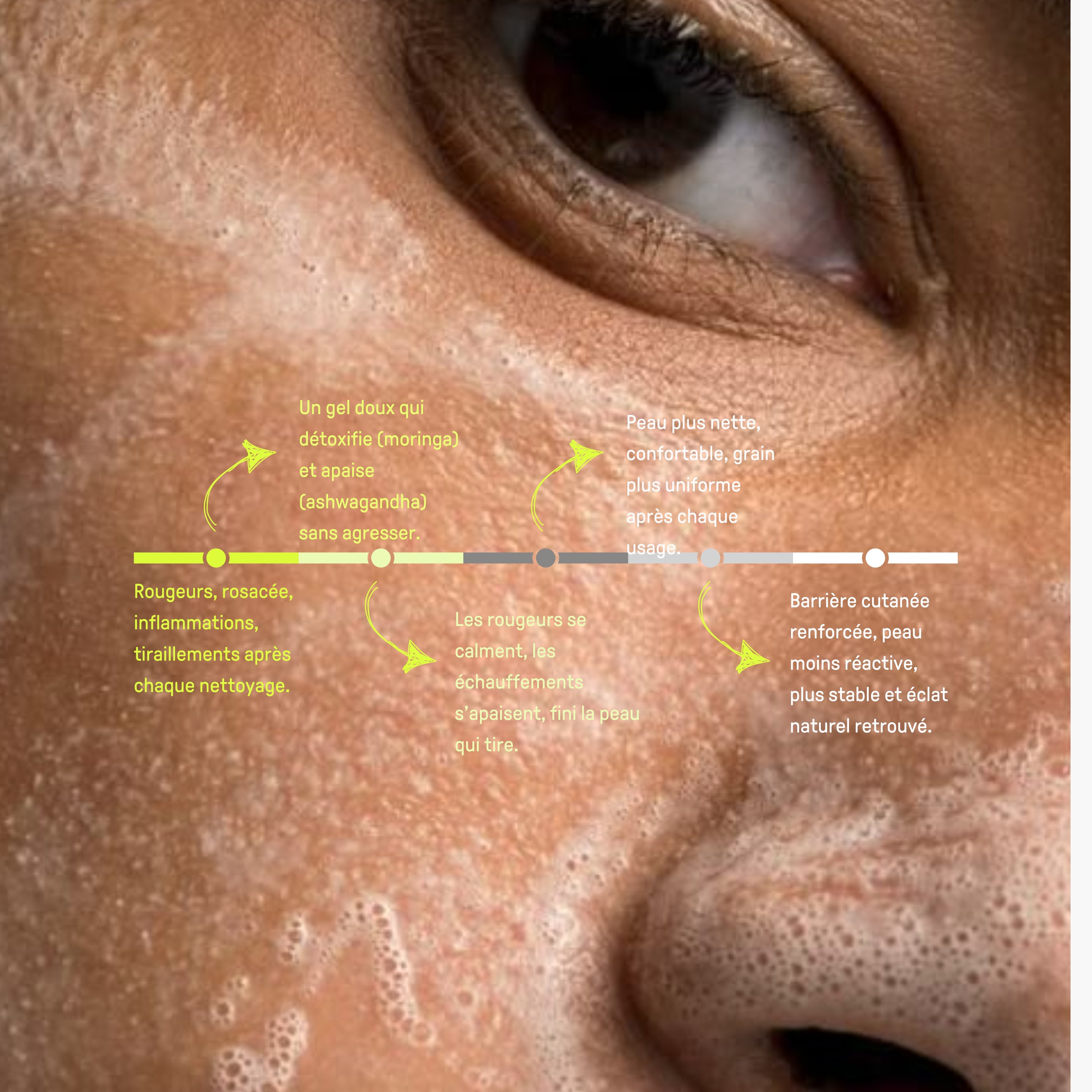 Nettoyer en profondeur et exfolier permettent d’éliminer les impuretés qui étouffent la peau et provoquent des inflammations, mais tendent à détruire ce qui protège notre peau, comme les huiles naturelles qui contribuent à son équilibre. Quand notre barrière cutanée, affaiblie, ne parvient plus à se protéger contre les aléas de l'environnement, la peau devient sensible et s’assèche.