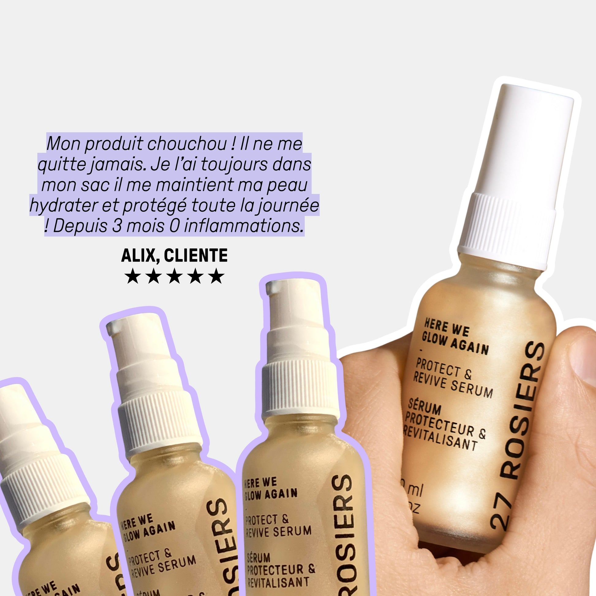 "J'ai de la rosacée et des boutons. Et je suis une personne ultra stressée vivant à Lyon. Des la première application j'ai senti ma peau calmée sans réactions." Adeline