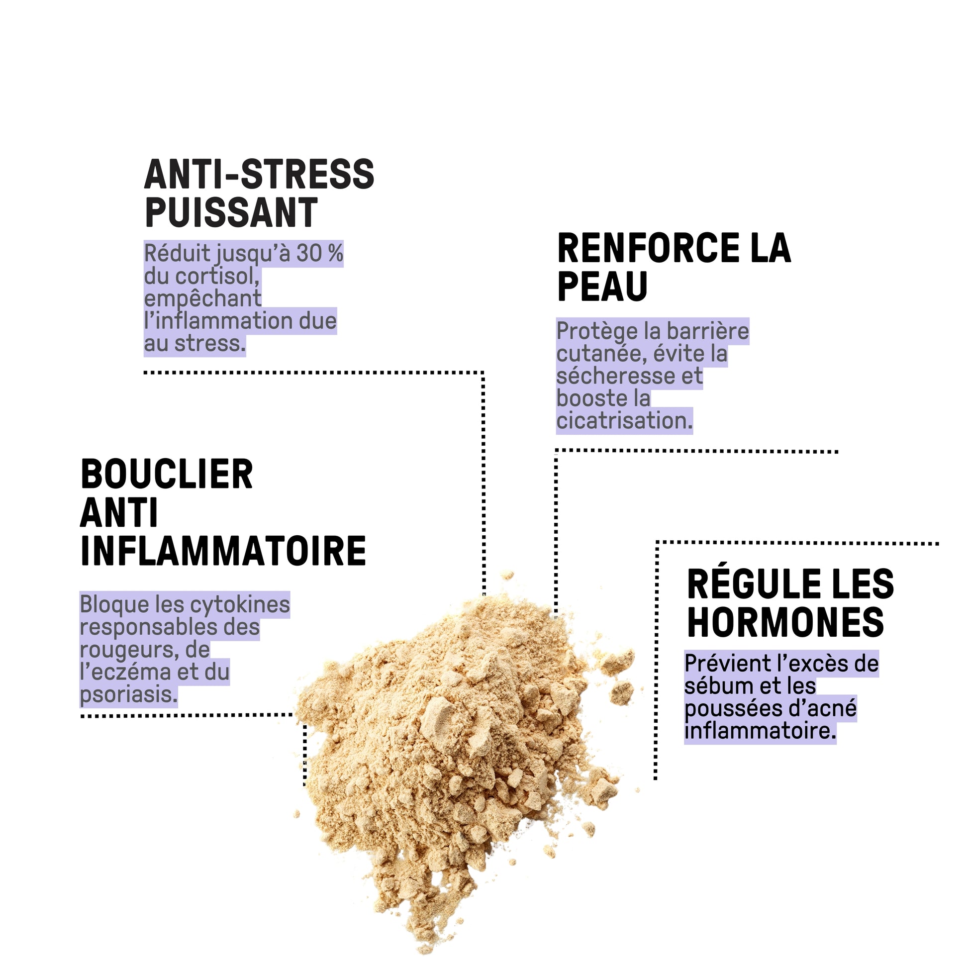 Quatre ingrédients anti-inflammatoires naturels : Aloe vera, ashwagandha, calendula et camomille agissent en synergie pour apaiser les inflammations cutanées.