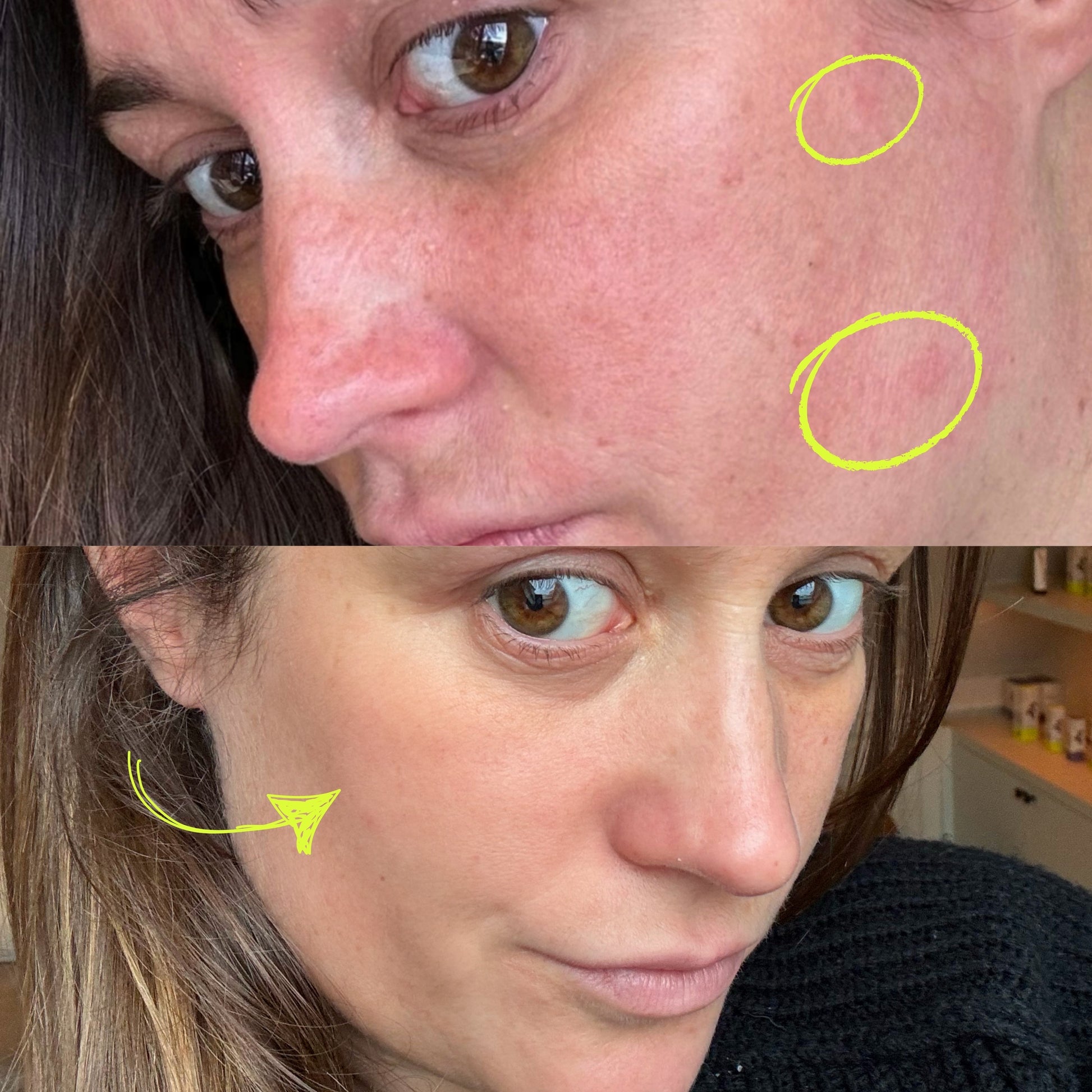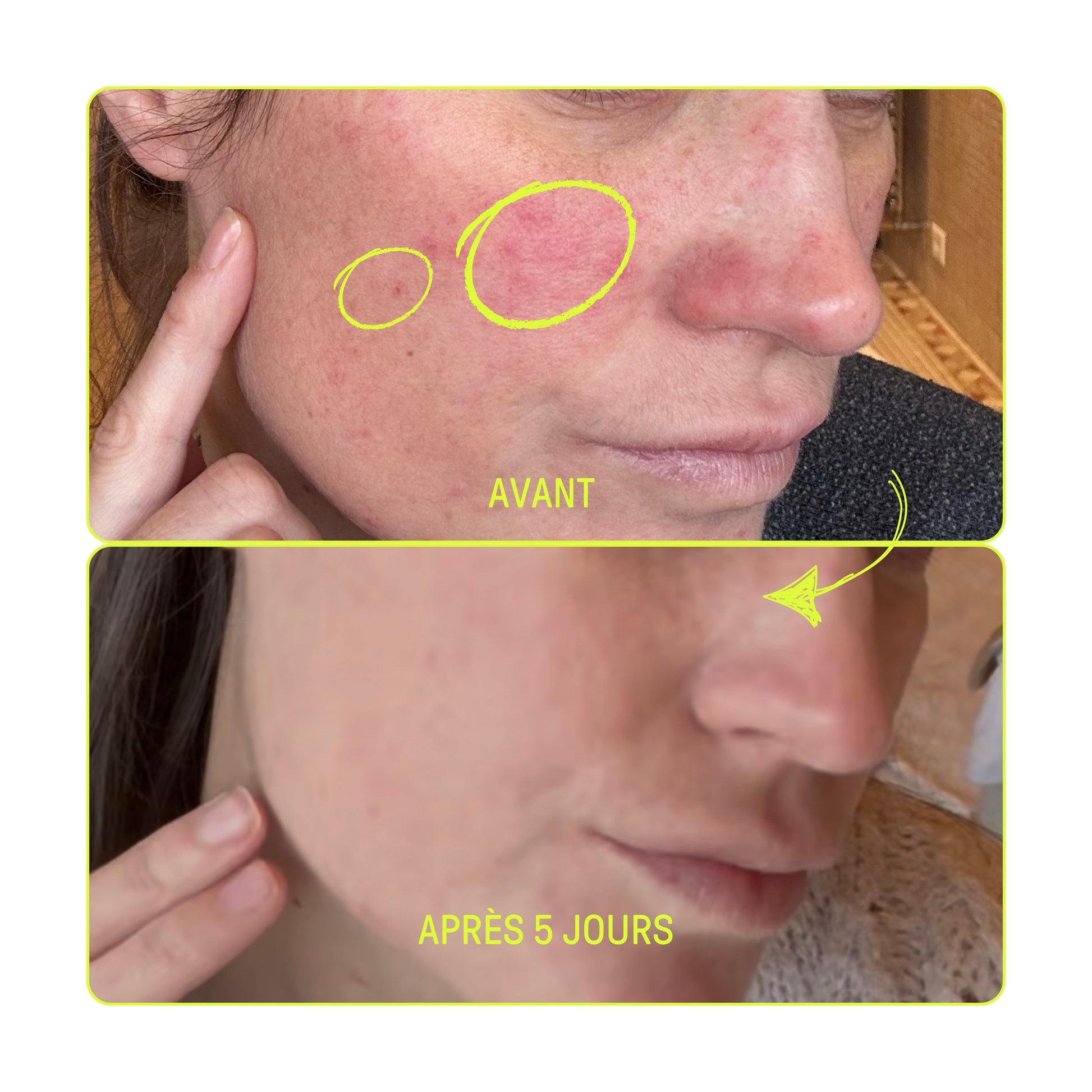 (Inflammations, rougeurs et acné améliorés dans le temps.)