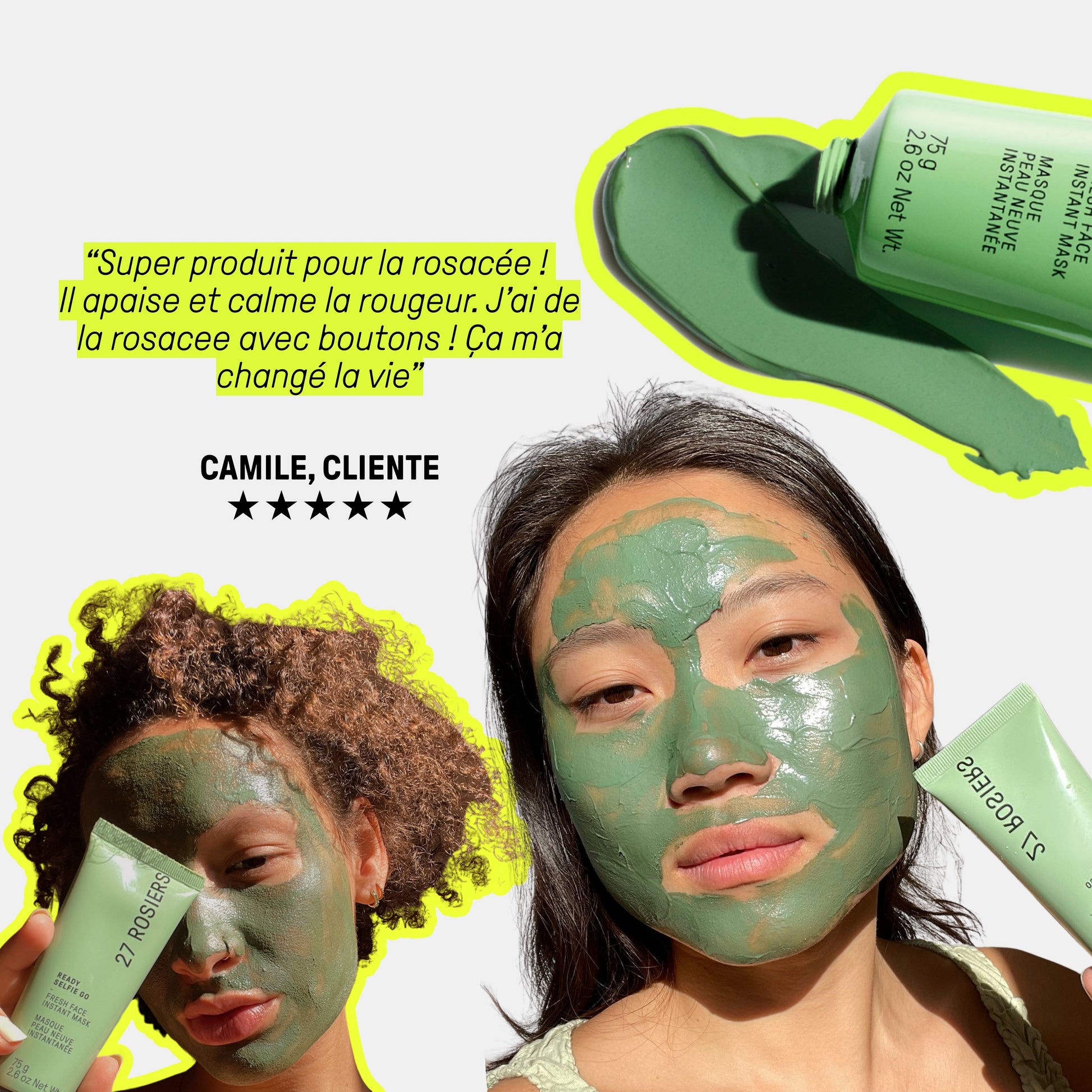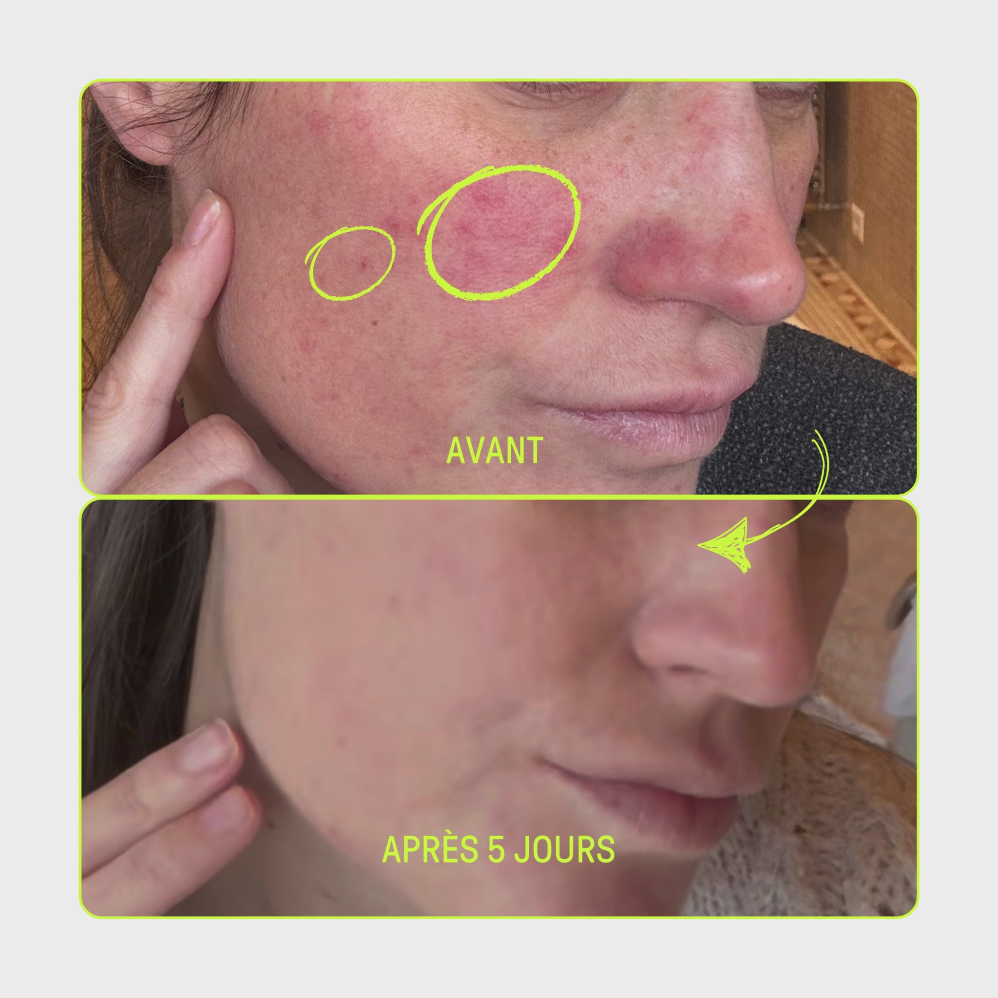 "Des la première application j'ai senti ma peau se calmer. J'ai des rougeurs et ma peau était en feu. Toute crème me brûlait. Ce masque a calmé ma peau immédiatement. Une semaine après la plaque avait disparu avec une utilisation 1 fois par jour tous les jours." Alix